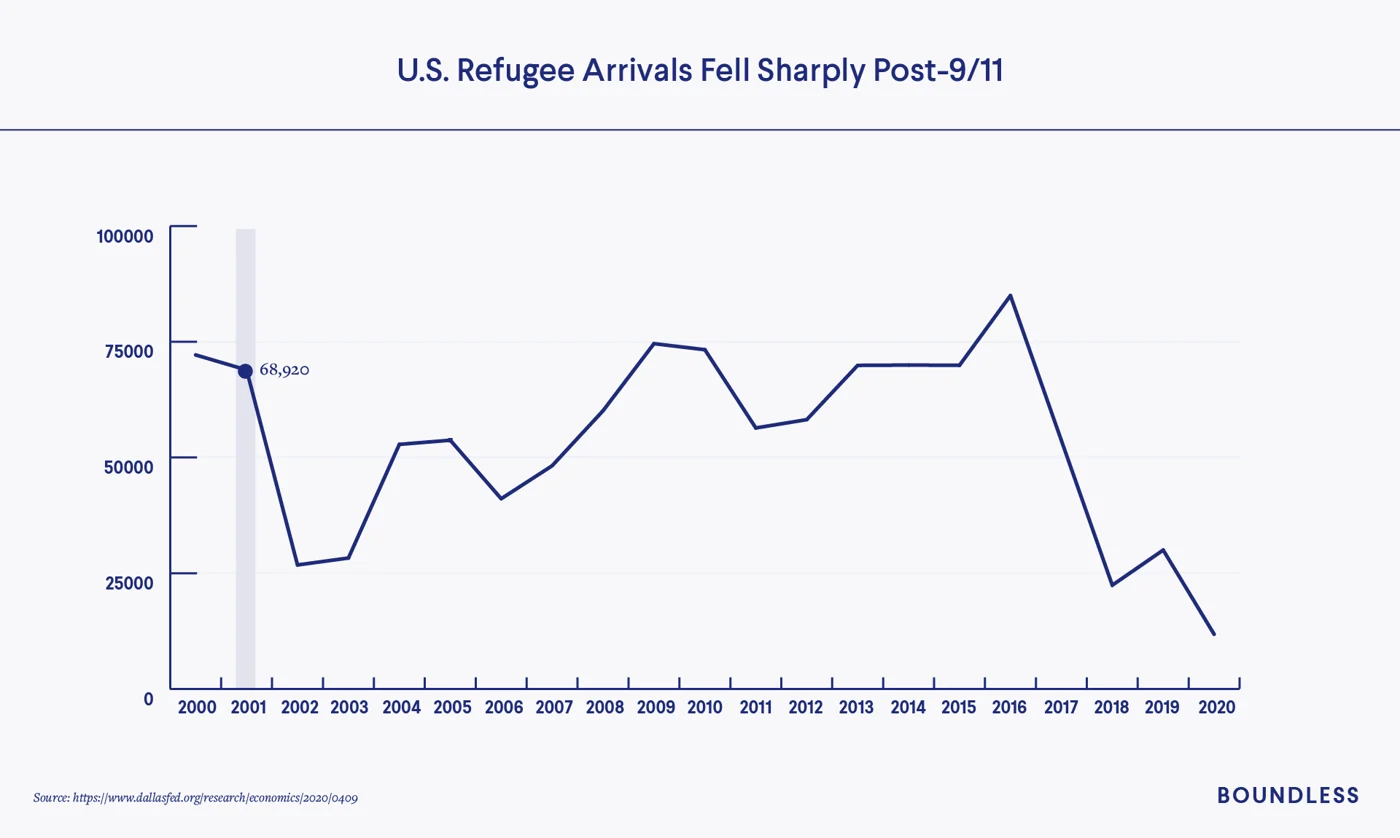 U.S. refugee admissions fell by 63% between 2000 and 2002, and didn’t return to pre-9/11 levels until 2009.
