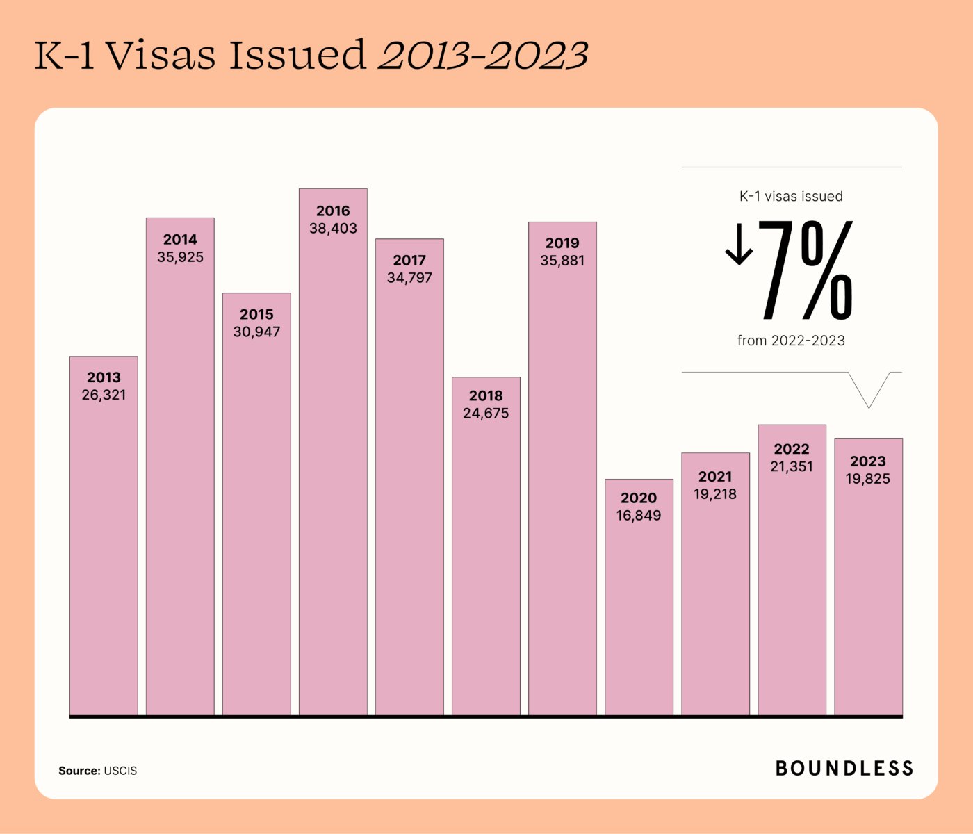 K-1 visa issuances decreased in FY2023, from 21,315 in 2022 to 19,825 in 2023 — a 7% decrease. The number of K-1 visas issued are still nowhere near pre-pandemic levels of 35,881 in 2019, or the decade-high of 38,403 in 2016. Note: For issuances, FY 2023 is the latest data is available.